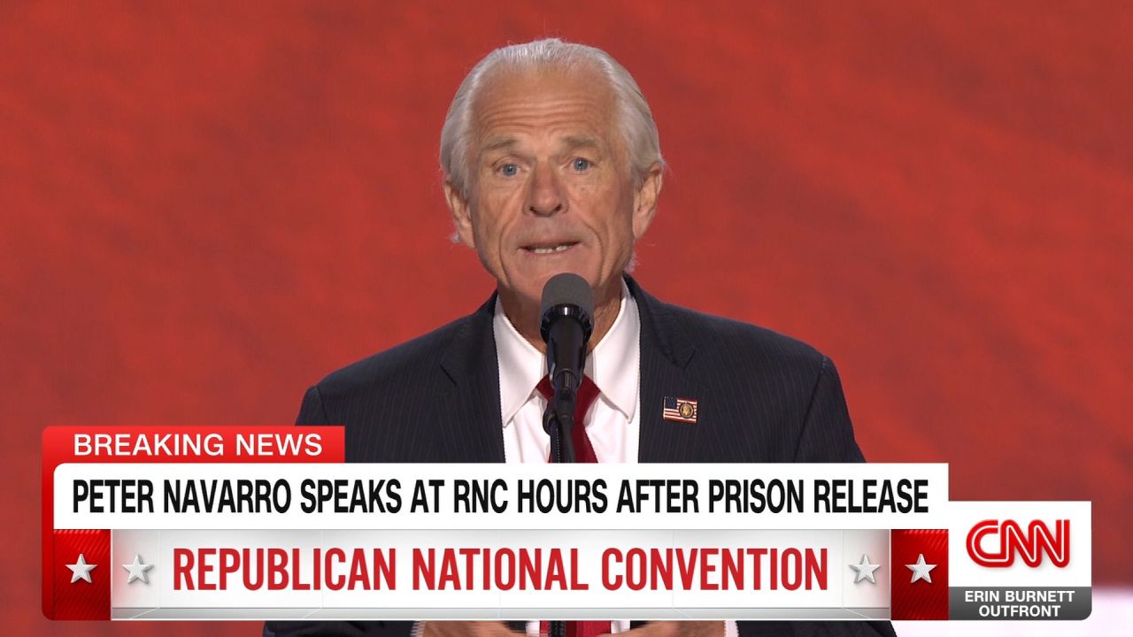 Former Trump White House adviser Peter Navarro spoke at the Republican National Convention on Wednesday, just hours after he was released from a Miami federal prison following his completion of a four-month sentence for defying a subpoena from the January 6 congressional committee.